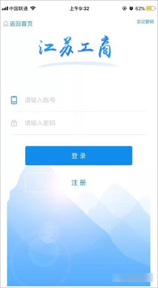 1、下载安装江苏市场监管app,点击打开注册账号,如果是老用户的话直接输入账号名与密码,点击登录;