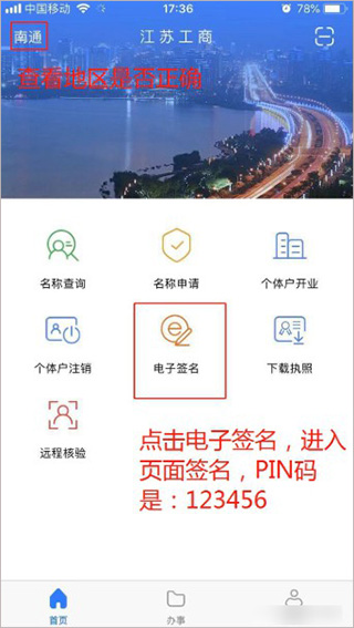 5、人脸识别完成后,我们查看首页左上角地区,是否是我们注册公司所在地区,如果不正确,点击切换地区。然后点击电子签名,进入签名页面,输入PIN码默认是123456