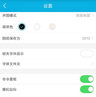 1、打开图纸后,点击CAD看图王最新破解版软件右上方三个点按钮,点击设置,可以看到命令面板、放大镜等功能设置界面。