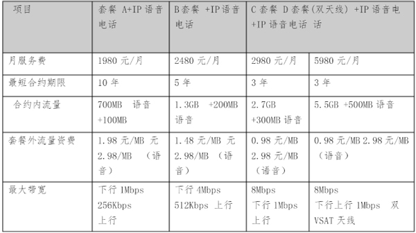 2、宽带卫星网络服务(含IP语音电话流量)套餐资费表