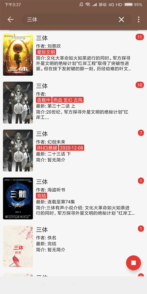 5、书源成功导入后就可以搜索并阅读书籍了。以小说《三体》为例,搜索的结果如下