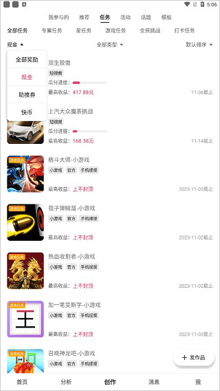 在快手创作者版App里,点击底部的“创作”,在这里有各种各样的任务、活动以及话题,选择对应的板块,并根据要求完成任务即可领取奖励。