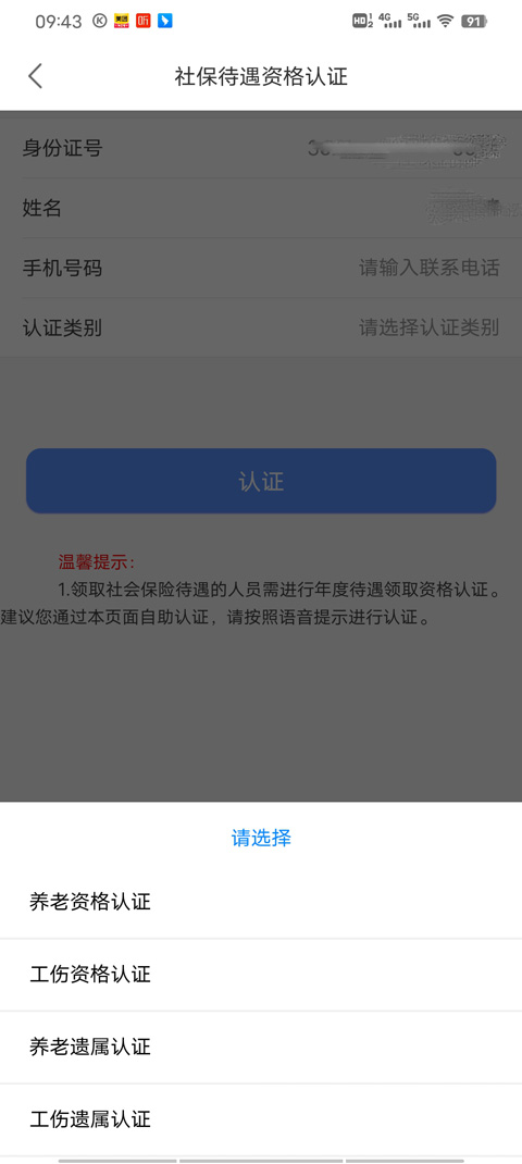 4、确认自己的身份信息后,输入手机号码,在认证类别中选择养老资格认证后,点击认证即可。