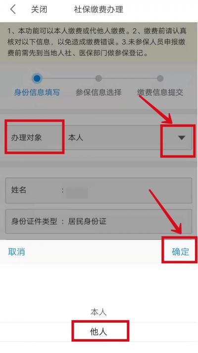 4、根据提示填写相关信息,如为他人缴费,可在“办理对象”处选择“他人”,点击“确定”,输入姓名、身份证号、手机号等信息,填写完成后,点击“下一步”;