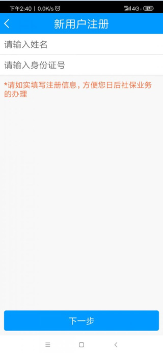 3、点击“新用户注册”输入姓名和身份证号然后点击下一步