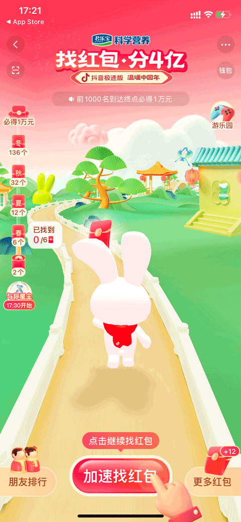 活动春、夏、秋、冬共188个红包,点击加速找红包,会出现现金红包、优惠券红包,还会出现加速飞机可以加速,也能收取好友的加速飞机,胡萝卜可以跳起来吃。
