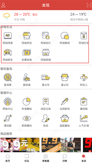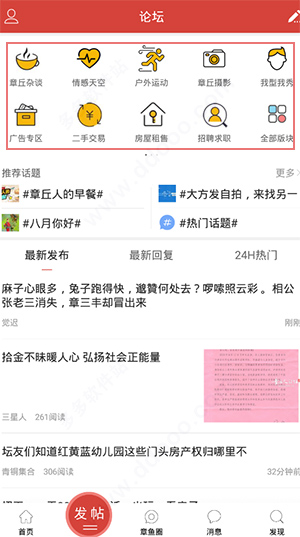 1、在本站下载安装章丘人论坛app,在手机上运行软件,可以发现有首页、论坛、章鱼圈、消息、发现五个板块;2、在首页,用户可以求职、相亲交友、优惠抢购等多种服务;