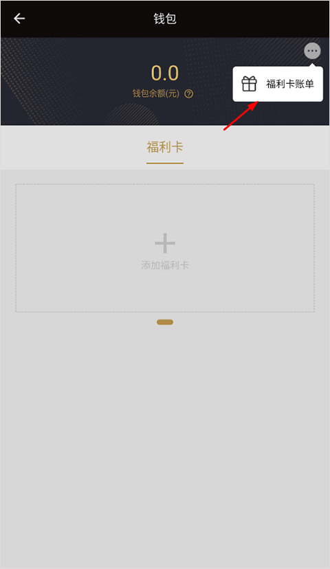 2、点击上面的三点图标,点击上面的福利卡账单选项;
