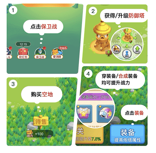 二、点击保卫战,获得/升级防御塔、购买空地、穿装备/合成装备均可提升战力