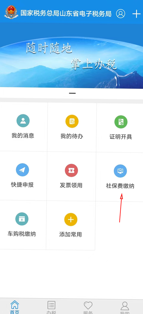 1、进入app首页点击社保费缴纳。