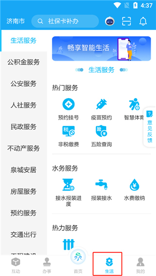 4、点击生活,该板块为用户提供了公积金。公安。人社。不动产、民政、房屋等等服务。