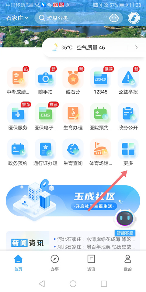 1、用户在手机上打开并登录掌上石家庄石i民app,进入首页中点击【更多】