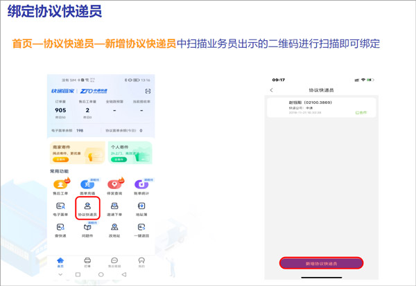 首页—协议快递员—新增协议快递员中扫描业务员出示的二维码进行扫描即可绑定。