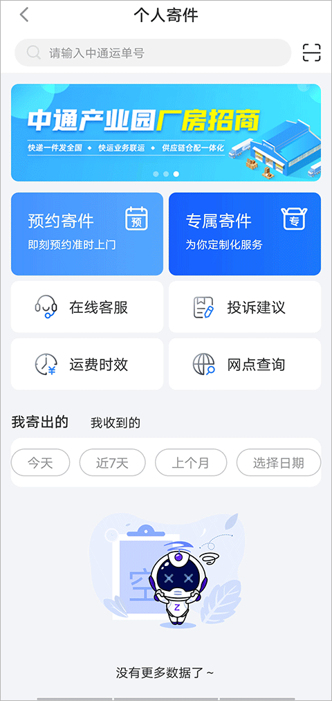 中通快递app是中通官方出品的一款集寄件、查件、运费和时效查询、线上售后等功能为一体的综合快递物流服务平台,它能够完美的在手机中演绎电脑上所有的操作,能够快速进行线上寄件&查件、订单管理、打印电子面单、附近网点&运费&时效查询等众多实用性功能。