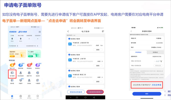 如您没有电子面单账号,需要先进行申请,线下客户可直接在app发起,电商客户需要在对应电商平台申请电子面单—新增网点面单—“点击去申请”将会跳转至申请界面