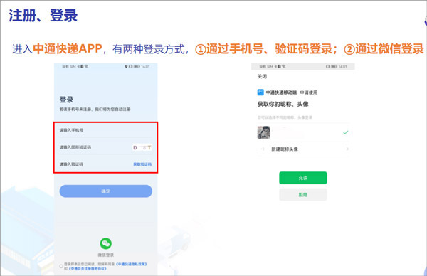 进入中通快递app,有两种登录方式,通过手机号、验证码登录或者通过微信登录。