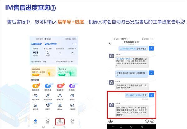 售后客服中,您可以输入运单号+进度,机器人将会自动将已发起售后的工单进度告诉您。