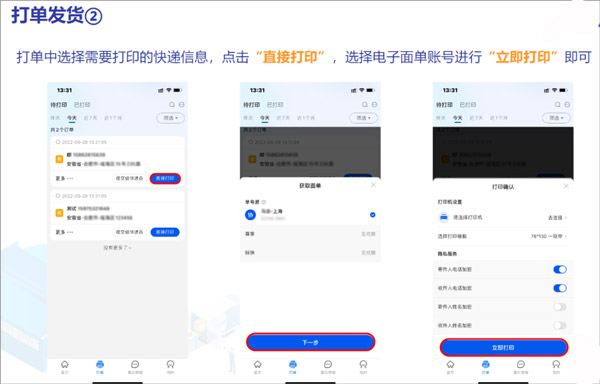 打单中选择需要打印的快递信息,点击“直接打印”,选择电子面单账号进行“立即打印”即可。