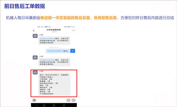 机器人每日早晨都会推送前一天您发起的售后总量、各类型售后量,方便您对昨日售后内容进行总结。