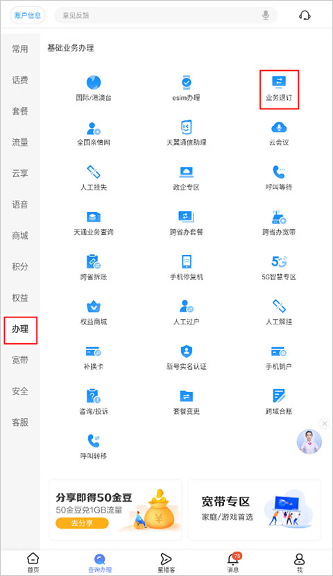 1、同样是在中国电信app的“查询办理”界面选择“业务退订”
