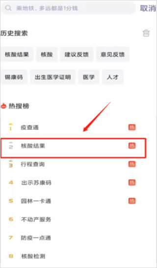 3、选择热搜榜中的“核酸结果”,或在搜索框中直接搜索“核酸结果”;
