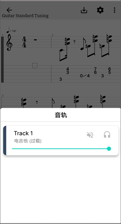 - GTP 乐谱支持轨道音量调节,可以静音吉他轨道,把乐谱作为伴奏跟随乐谱演奏
