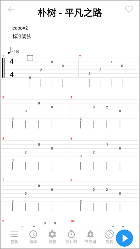 2、选择好进入即可看到这首歌曲的吉他谱曲,点击右下角可以进行播放曲子跟随一起弹奏,下方还有诸多的功能可以帮助你更好的练习吉他。