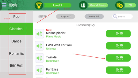 6、搜索钢琴乐曲,按排序搜索,A-Z按字母或输入乐曲搜索