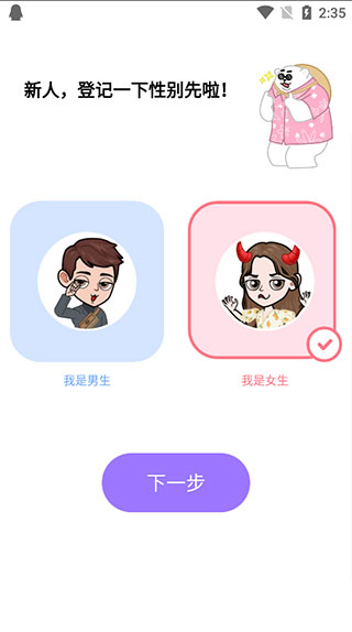 2、新人,登记一下性别先啦!选择我是男生或女生、选择好了点击下一步;