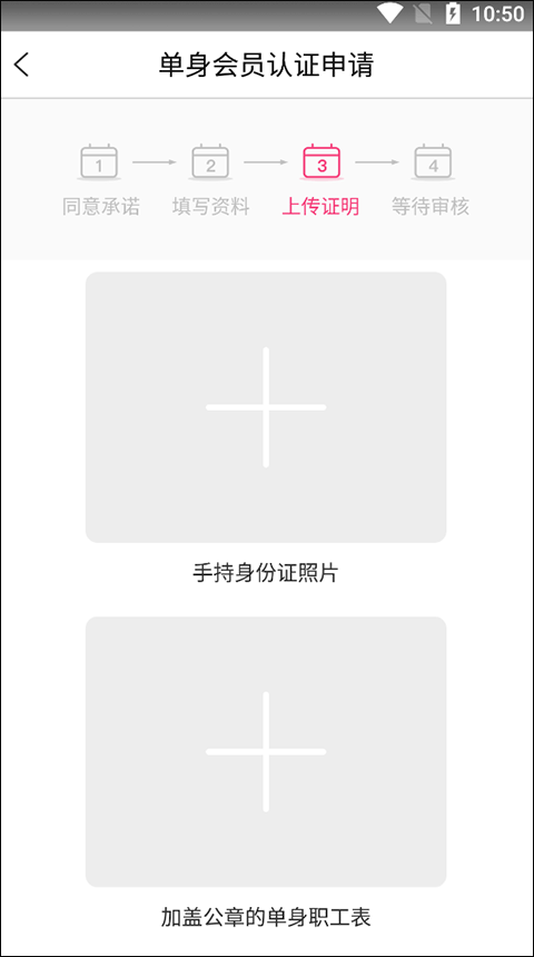 4、接着在这里上传好手持身份证的照片、加盖公章的单身职工表后找到并点击“确认提交”选项;