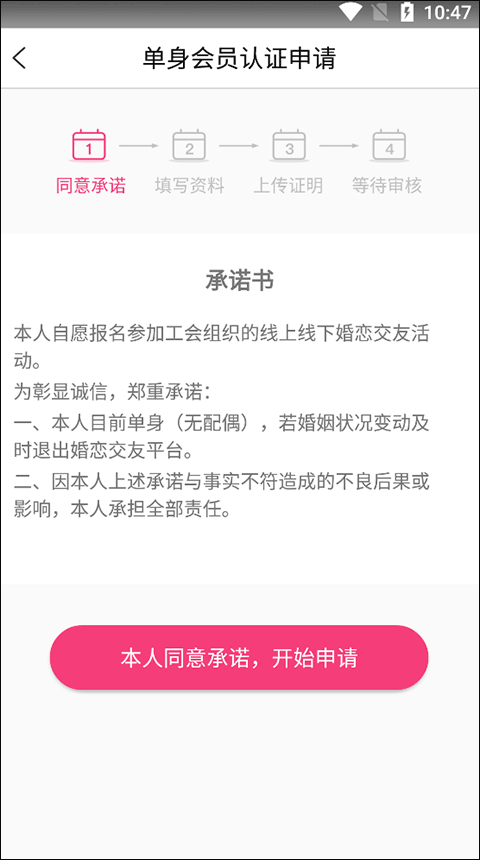 2、然后,在单身会员认证申请界面看清楚承诺书内容后找到并点击“本人同意承诺,开始申请”选项;