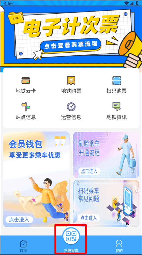 1、打开软件点击进入主界面,点击下方的“扫码乘车”图标