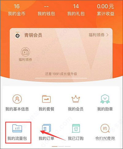 4、当我们进人个人页面以后,我们要从页面中选择“我的流量包”之后,点击打开我的流量包。