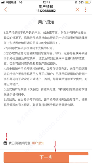 3、之后是销户合同的一堆注意事项吧啦吧啦,选择已经阅读并同意,接着下一步