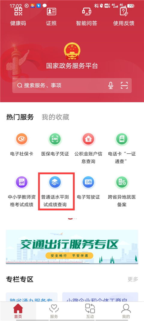 1、进入软件首页,我们里面为用户用户了海量热门服务,如电子社保卡、中小学教资考试成绩、电子驾驶证等等,我们点击普通话水平测试成绩查询;