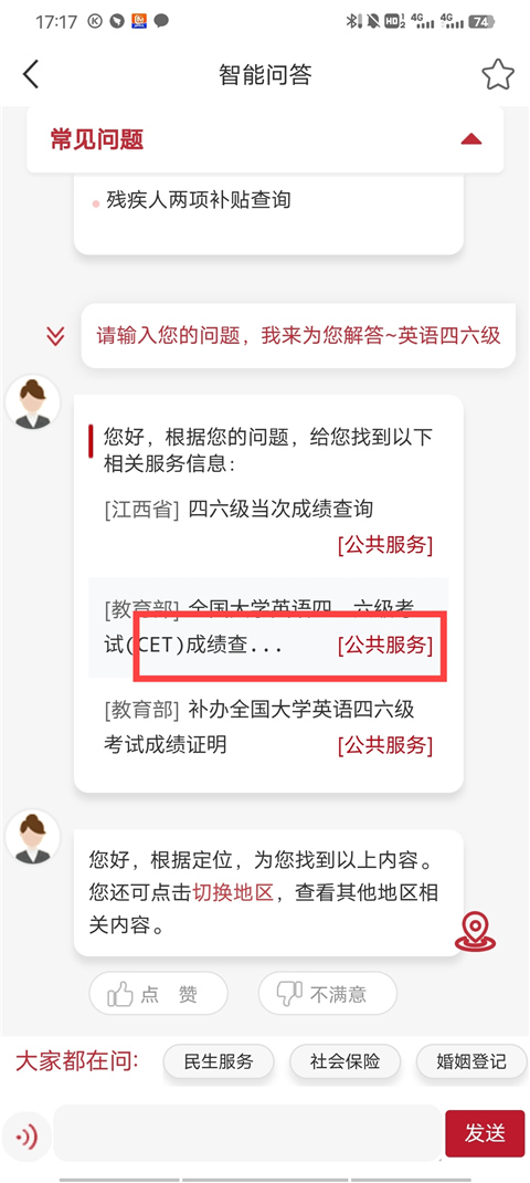 2、输入英语四六级这个个字后,系统会自动检索关键字,我们可以看到全国大学英语四六级成绩查询,点击红色的公共服务即可直达;