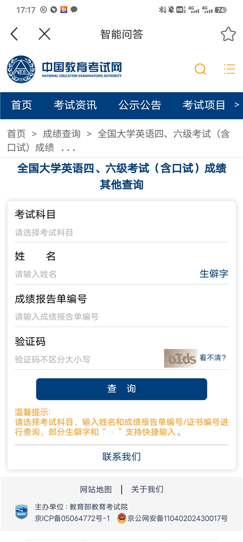 2、输入你的姓名、身份证号、准考证号和验证码即可查询到自己的成绩。