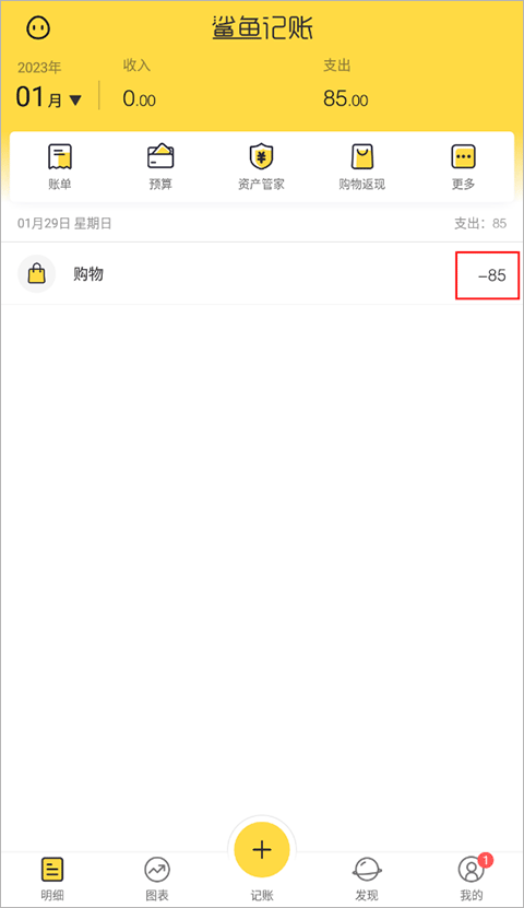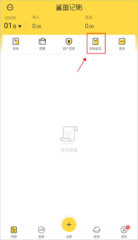 1、首先打开鲨鱼记账app,在明细页面,点击【购物返现】。