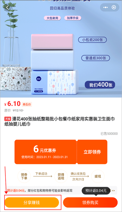 3、在商品详情页面,点击【分享赚钱】。
