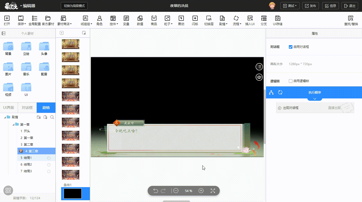 那么就需要在剧情的最后一张画布使用“剧情-剧情跳转” 功能,当运行到这个画布时就会跳转第一章。