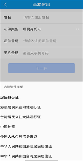 3、然后输入自己的姓名、证件号码、手机号码等基本信息,并选择证件类型即可进行下一步操作;