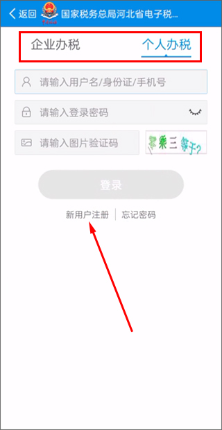 2、登录时用户可根据自身选择企业办税和个人办税,首次使用需进行注册,点击“新用户注册”即可;