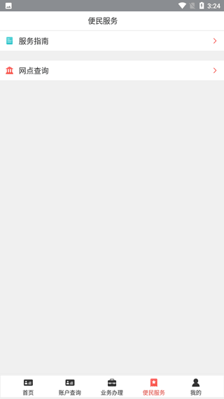 4、点击便民服务,拥有服务指南、网点查询两种功能可以使用,用户可以根据服务指南快速的进行自己想要的操作