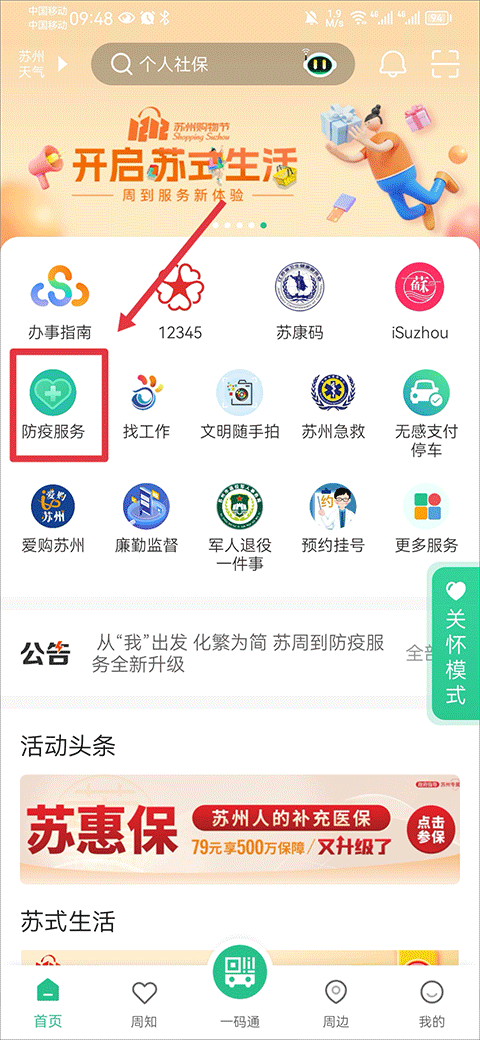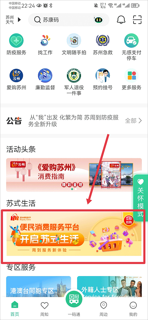1、打开苏周到app,在首页中点击苏式生活内的便民消费服务平台