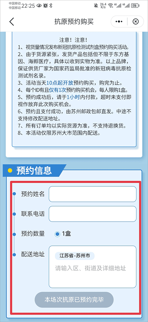 最近感冒退烧药很难买,抗原试剂盒也成了紧俏货。苏周到这个App挺方便的,每天10点开始预约购买,每人只能买一次,限量一盒。还能上传抗原检测结果,有详细的操作指南,适合新手。