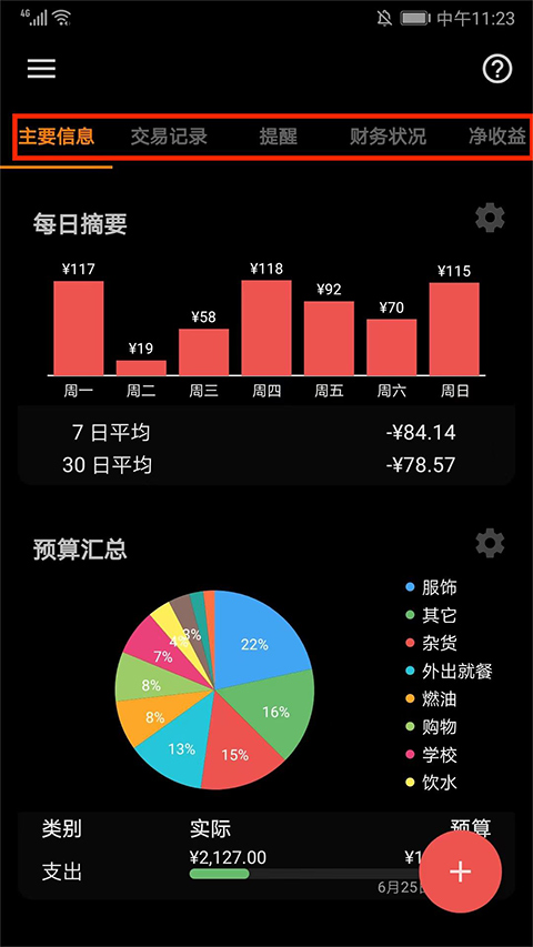 2、进入应用主界面,包括主要信息、交易记录、提醒、财务状况、净收益等不同的分栏,