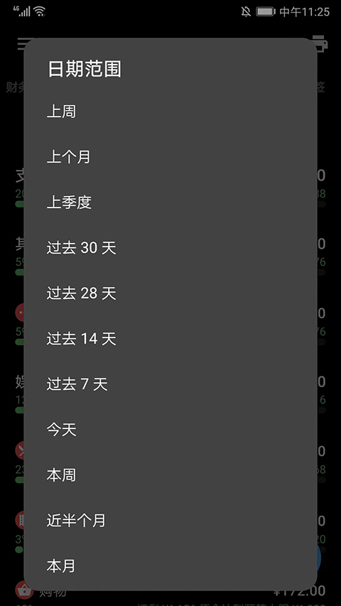 8、进入预算汇总栏目,可看到当前支出、其他、娱乐等项目离预算的上限情况,点击上方的时间信息,可以选择上周、上个月、上季度、过去30天等日期范围,