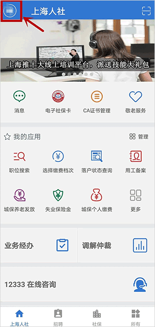 1、首先打开上海人社,点击左上角圆形图标注册/登录人社账号;