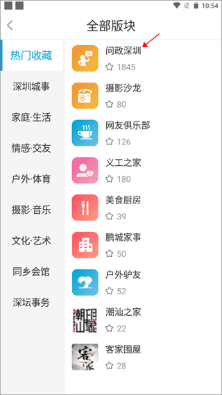 2、选择你要发帖的版块,以问政深圳为例,点击这个版块。