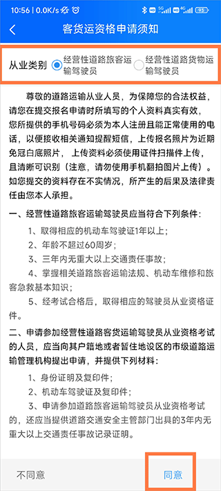 3、认真阅读申请须知,选择从业类别,确认无误后选择同意